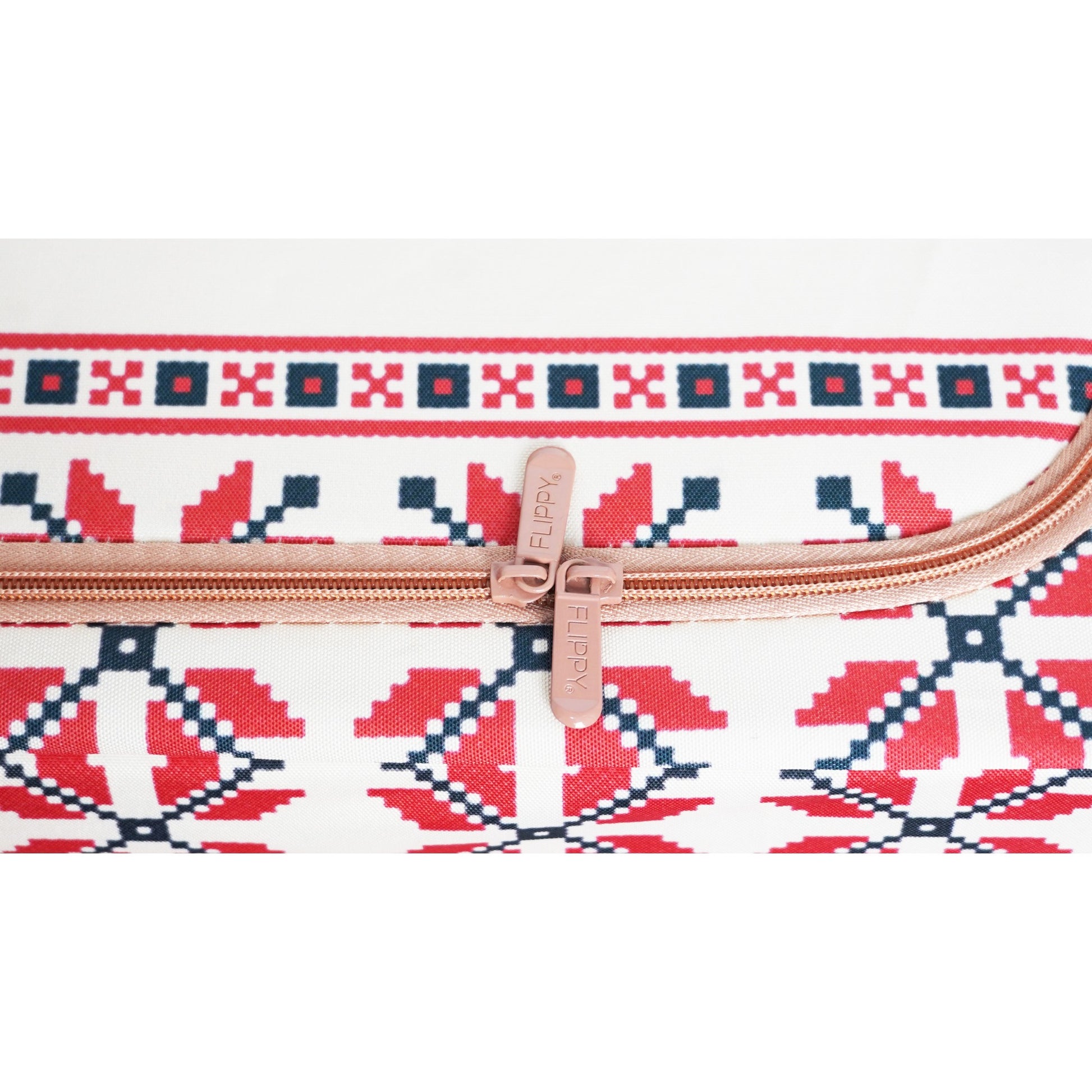 - Dispune de două uși de acces cu fermoar bidirecțional, una în partea superioară și una frontală, facilitând introducerea și scoaterea articolelor fără efort.