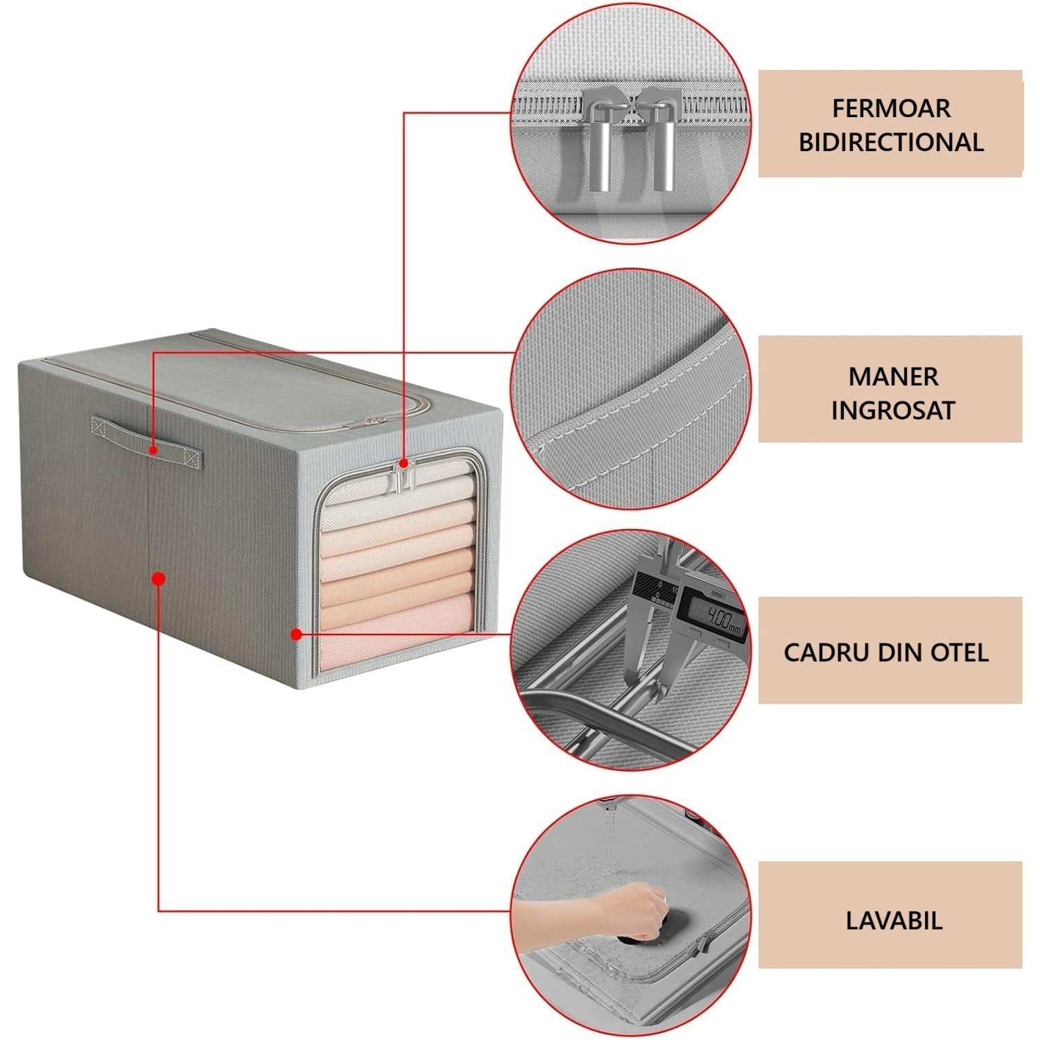 Vizibilitate completă a conținutului fără a desface cutia. Acces rapid prin fermoar frontal și superior (tip capac), ideal pentru depozitare eficientă.