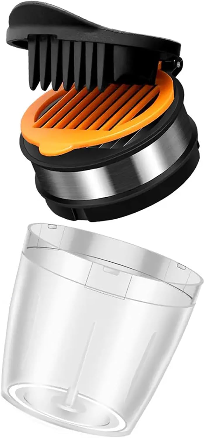- Ușor de utilizat: Tot ce trebuie să faci este să apeși feliatorul pe fructe sau legume. Chiar îl poți folosi și pentru ouă! Folosește placa de împingere pentru a împinge alimentele prin cupă.