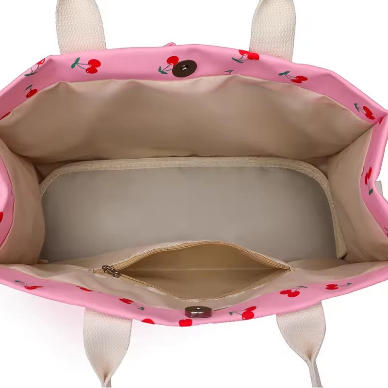 Geanta de Mana/Umar, Multifunctionala, selexmo, Inchidere cu Capsa, Imprimeu Cirese, Material Textil, 33.5 x 25 x 14.5 cm, Roz