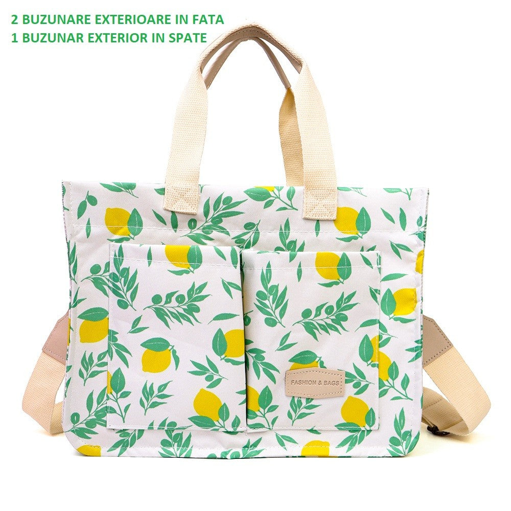Geanta de Mana/Umar, Multifunctionala, selexmo, Inchidere cu Capsa, Imprimeu Lamai, Material Textil, 33.5 x 25 x 14.5 cm, Alb/Galben