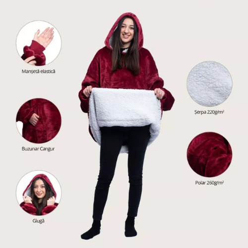 Huggle Hoodie este o patura foarte moale si calduroasa care are maneci lungi si largi, gluga si buzunar extrem de practice.