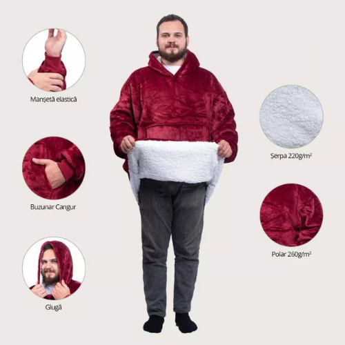 Hanoracul cu patură, glugă și mâneci este o piesă vestimentară multifuncțională și confortabilă, concepută pentru a vă menține calzi și confortabili în sezonul rece. Acest hanorac are caracteristici speciale pentru a oferi o izolație termică suplimentară și pentru a vă păstra confortul în timpul zilelor reci.
