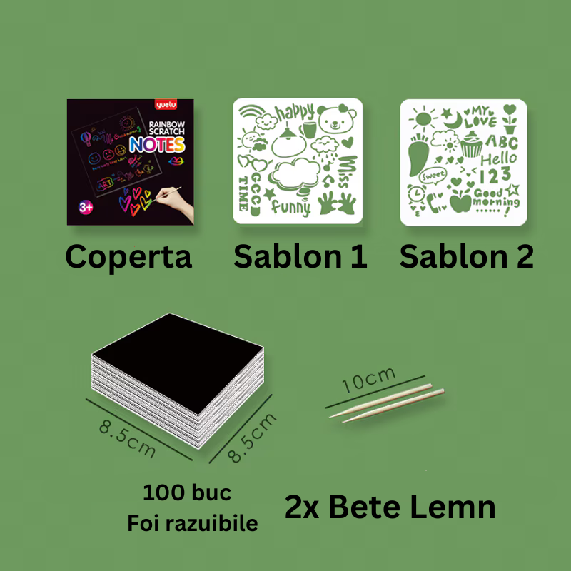 Transformă desenul într-o experiență magică cu Hârtia Magică Răzuibilă! Pur și simplu zgârie suprafața neagră și descoperă culorile vibrante ascunse dedesubt. Perfectă pentru copii și adulți care vor să-și exprime creativitatea!