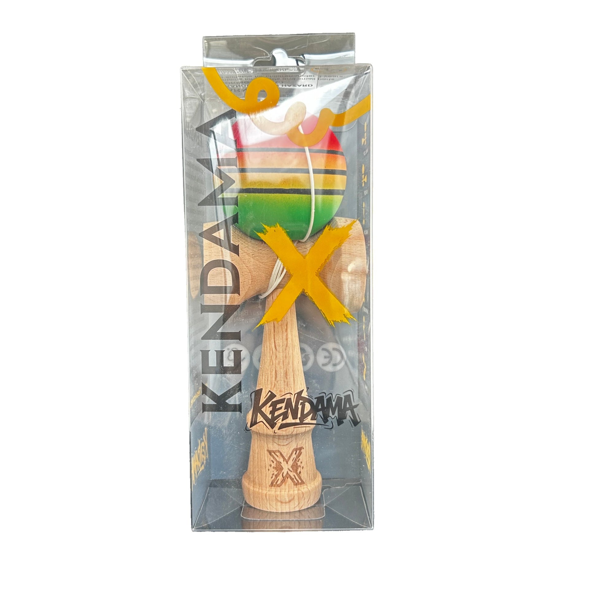 Jucarie Kendama X Originala, Profesionala, Selexmo, din Lemn, Bila din Cauciuc, 18 cm, Rosu/Galben/Verde