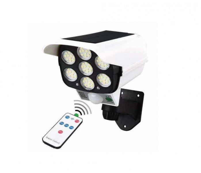 Camera falsa cu panou, Senzor de miscare si lumina,, 77 LED, IP65, rezistent la apa, telecomanda inclusa, 3 moduri de iluminare