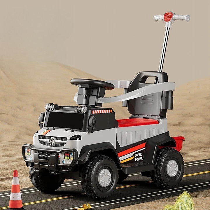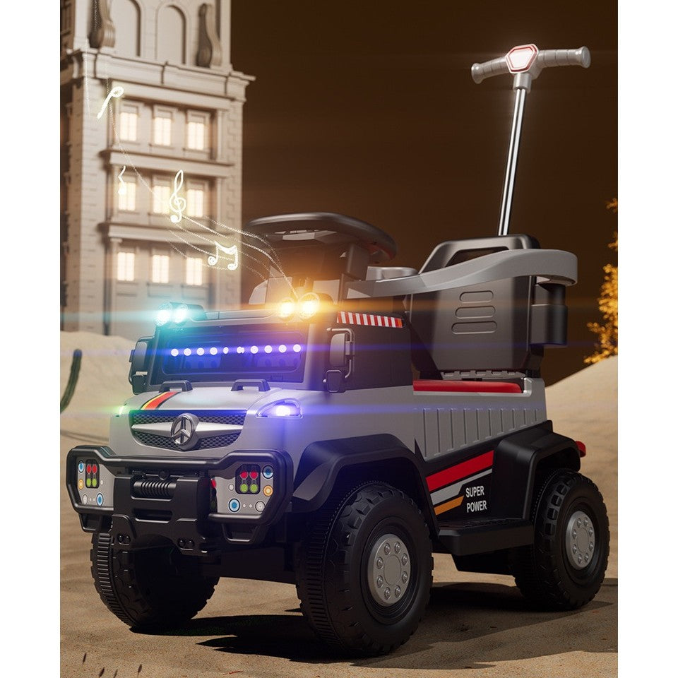 Masinuta Electrica,, pe 4 Roti, cu Telecomanda si Maner Detasabil, Cos de Depozitare, Lumini Led si Muzica, +1 an, Greutate Portanta 40 kg