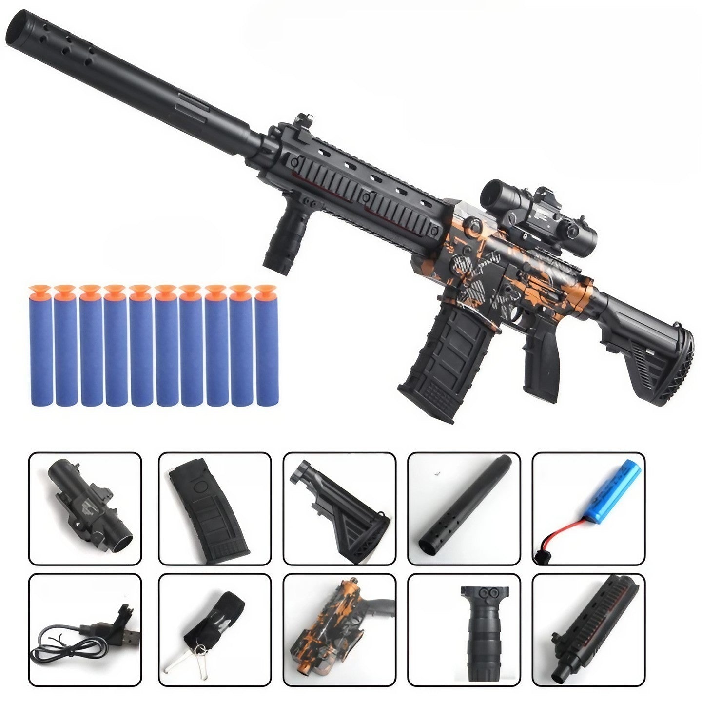 Pusca de Jucarie M416 Ultrarealista, cu Luneta, 10 de Proiectile din Spuma Moale, fara Cartuse, 95 cm, Negru Portocaliu