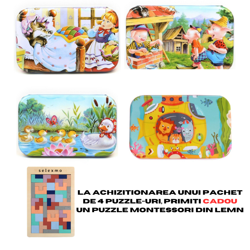 - Design atractiv și diversificat: Puzzle-ul vine într-o varietate de modele care vor captiva atenția copiilor, cum ar fi Scufița Roșie, Submarin Educativ, Cei Trei Purceluși sau Rățuștele pe Lac. Aceste teme variate adaugă un element de noutate și surpriză la fiecare joc.