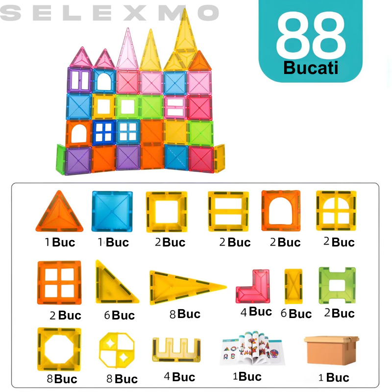 Descopera minunata lume a constructiilor si creativitatii cu setul de jucarii cu magneti, un instrument esential pentru dezvoltarea abilitatilor cognitive si motorii ale copiilor. Acest set inovator cu placi magnetice, compus din 60 de piese captivante, le ofera celor mici o oportunitate fascinanta de a construi si crea propriile lor universuri .