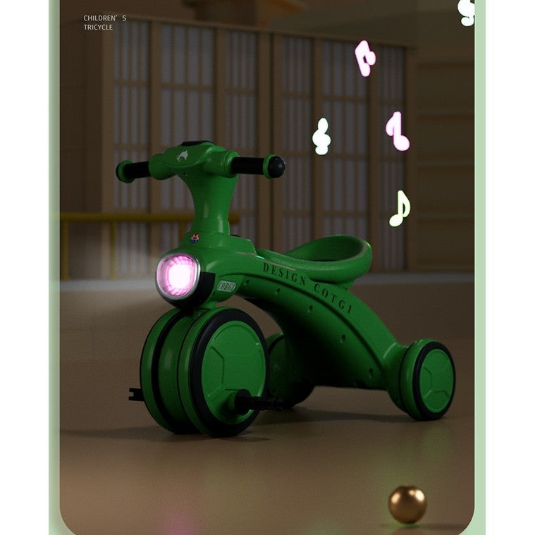 TRICICLETA PENTRU COPII, PEDALARE, IMPINGERE, LUMINI SI SUNETE, PEDALE ANTIDERAPANTE, MATERIAL DUR, COS DEPOZITARE, VARSTA PESTE 18 LUNI, 80X40X52 CM, VERDE