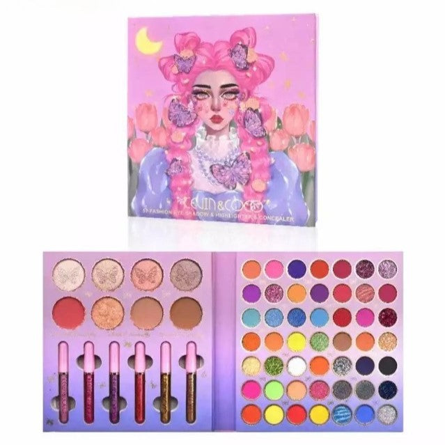 Culoare:Multicolor|Tip:Profesional|Cantitate pachet:500 g|Greutate:500 g|Numar bucati/set:Da|Proprietati:Fara sulfati|Zona corporala:Ochi|Componenta:53 x farduri, iluminator, rujuri|Forma-Textura:Pudra compacta|Tipul de ten:Mixt|Beneficii:Lunga durata|Numar nuante:53|Aspect:Mat|Nuanta:Multicolor|Cod culoare:Fashion